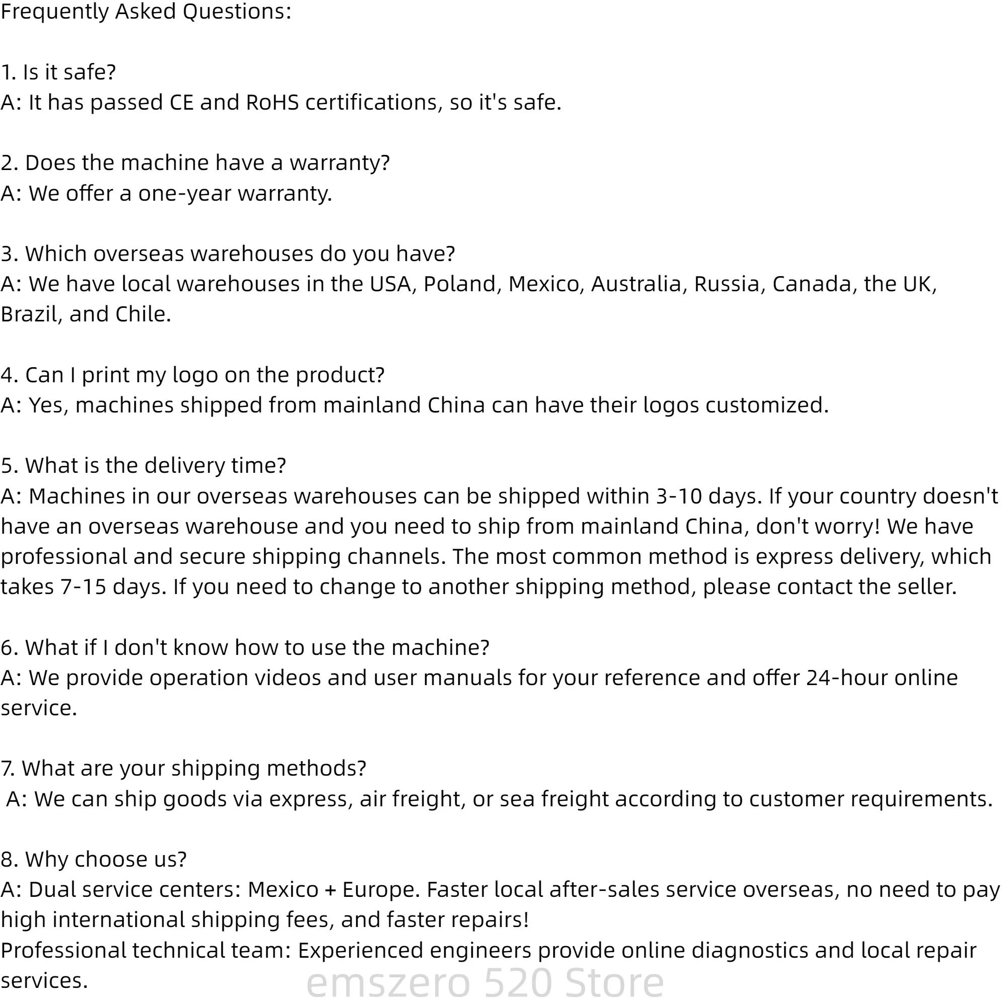 Dear customers, hello. We warmly welcome you to order our machines. We have local warehouses in the USA, Poland, Mexico, Australia, Russia, Canada, UK, Brazil, and Chile. Machines in stock can be delivered within 3-10 days. Due to the special nature of shipping methods, shipping costs vary by country and need to be calculated separately. Please consult customer service for specific shipping costs.